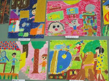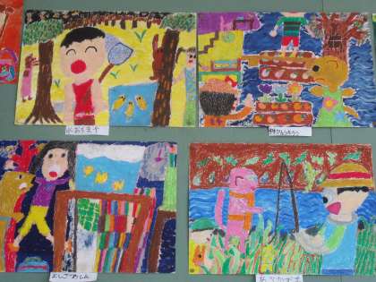 お話の絵が完成しました。お話の中の登場人物をを下がきするところから始めて,そのお話から思い浮かぶものや情景なども考えて仕上げました。みんなとてもいい作品になりました。