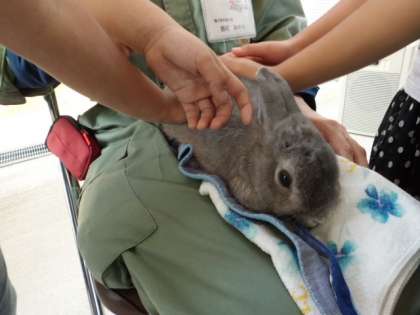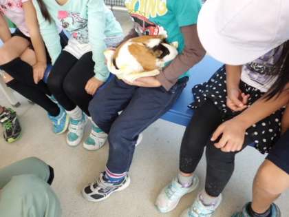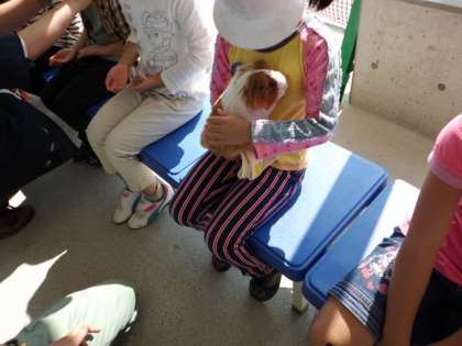 ふれあい体験で、一人ずつ「テンジクネズミ」を抱っこさせてもらいました。また「ウサギ」にもさわることができ、子どもたちは動物のフワフワとしたぬくもりを感じたことと思います。