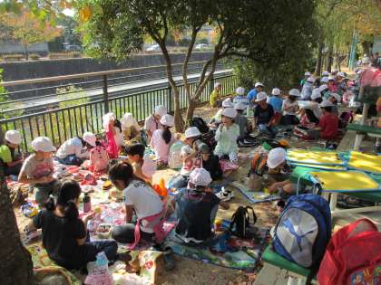 気持ちいいお天気のもと、動物園はたくさんの園児や他校の子ども達などでいっぱいの人でしたが、日かげの良い場所でお弁当を食べることができました。子どもたちは、お弁当包みを開けて「○○が入ってる〜!」と、おうちの方からの愛情弁当をうれしそうに食べていました。お弁当のご準備をありがとうございました。