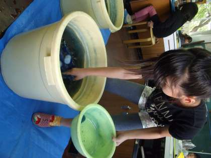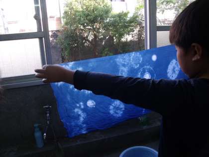 藍は植物でできていることや,生きてることを教えていただいた後,手ぬぐいに,輪ゴムや,洗濯バサミを使ってデザインを考えた後,藍で染めあげていきました。