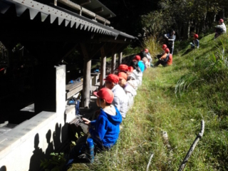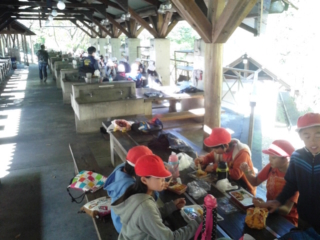 お昼ごはんはお弁当。グループごとにお気に入りの場所でいただきます。