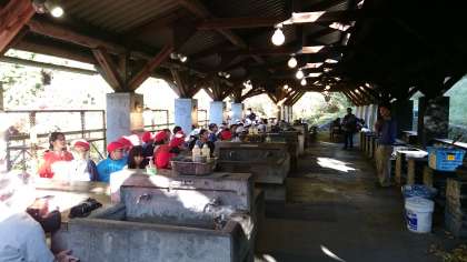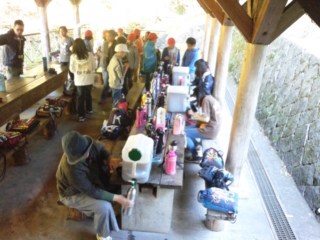 水筒のお茶も入れ替え,野外炊事の説明をしてもらっています。