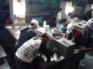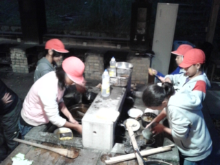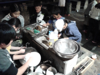 片付けもチームワークよく進めています。すす黒くなった鍋をしっかりこすっています。