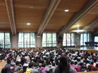 朝7時。雨も上がり山には雲がかかっていますが非常に過ごしやすい天気です。朝のつどいは4校合同。しっかり学校紹介もできました。