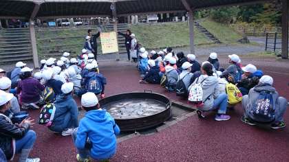 朝のつどいの後ストレッチをしました。昨日登った山を背に気持ちのいいストレッチでした。