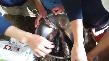 塩をふりかけて焼きます。自分がさばいた魚をじっくりと見つめています。