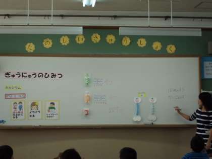 今回は、カルシウムのはたらきと、牛乳にたくさんのカルシウムが含まれている事を教えていただきました。丈夫な骨や歯をつくるために、好き嫌いなく食べてしっかりとカルシウムをとっていきたいものです。