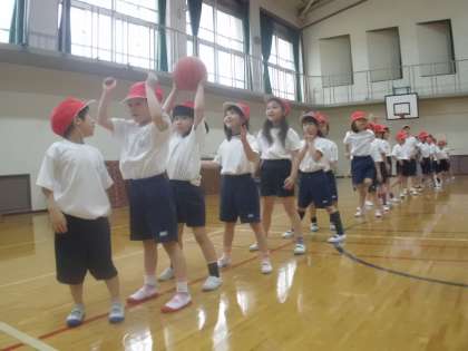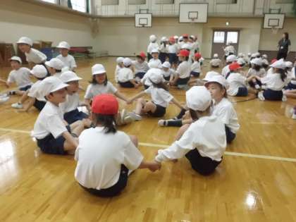 また,各クラス1列に並んで前から順番にボールを転がしたり,手渡したりするゲームも楽しみました。誰とでも仲良く,楽しく活動ができました。