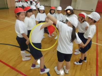 鳴らした音の数と同じ人数のグループを作ったり,手をつないで輪をくぐったりしながら体を動かしました。