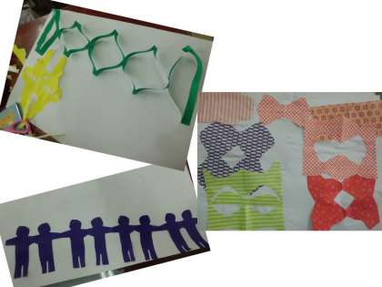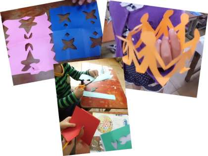 切り方の練習のあとは,自分の思いに合わせて色紙を折ったり重ねたりして切ることを楽しみました。すてきな模様の飾りができて大喜びでした。