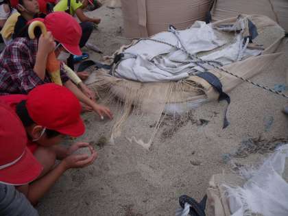 子ども達が観察しているこの砂。実は特殊な砂みたいです。運動場の砂や砂場の砂とは違って,とても細かくさらさらしていました。「この砂がきれいな水とどう関係しているんだろう。」と子ども達は疑問を抱いているようでした。