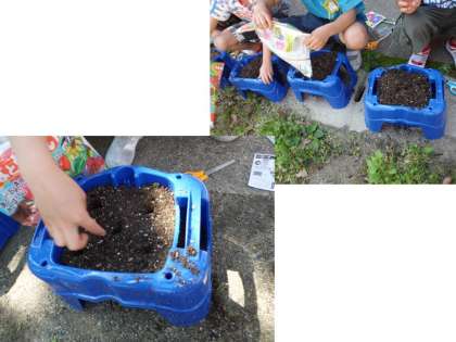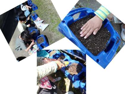 あさがおの種を観察した後,自分の植木鉢に,ていねいに種を植えました。