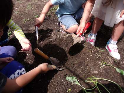 みんなで苗を植えるための土のベッドを掘り,