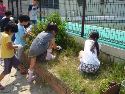3年生は,プールの周りの花壇の雑草抜きと,落ち葉拾いです。