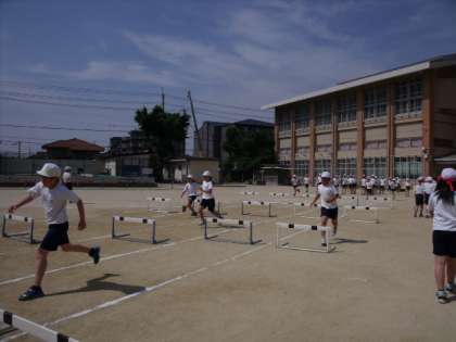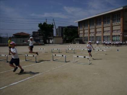 今日は運動会の障害物競争で走る,ハードル走の練習をしました。