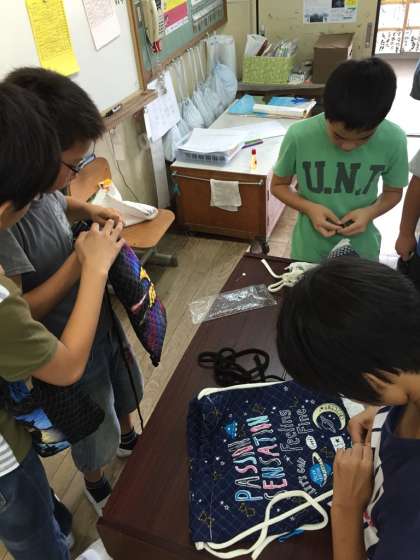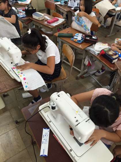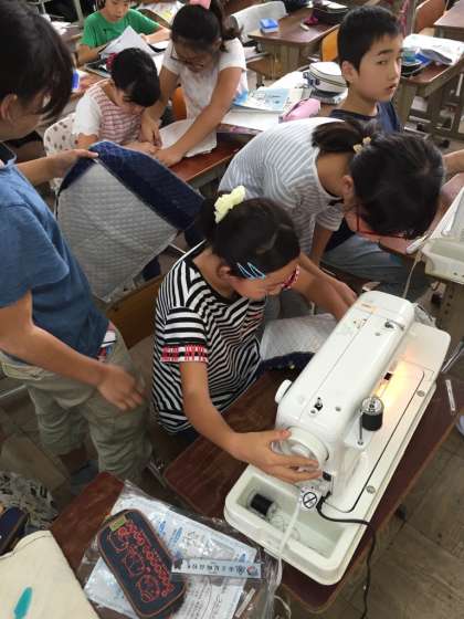 この日は,ひもを通す部分の布を重ねて縫うという難しいところでしたが,それぞれ教え合いながら頑張っていました。
