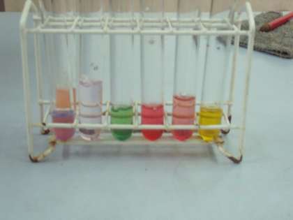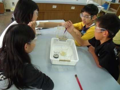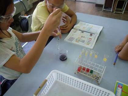 水,炭酸水,石灰水,酢,塩酸,水酸化ナトリウムの水溶液,オレンジにそれぞれムラサキキャベツのしぼり汁を加えて,何色に反応するかを実験しました。「次は緑やな!」「わぁ!ピンクになった〜」と子どもたちは色が変化する様子を楽しんでいました。