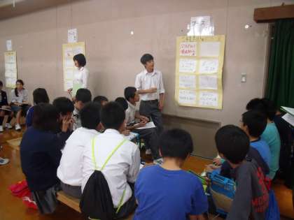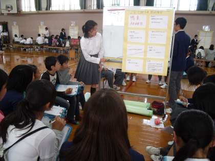 中学2年生の生徒たちが「職場体験で学んだことを伝える」という場で,ポスターセッション(討論)の学習でした。