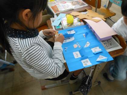 そして,その建物に模様を描いたり,折り紙を貼りつけたりして飾りました。