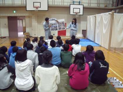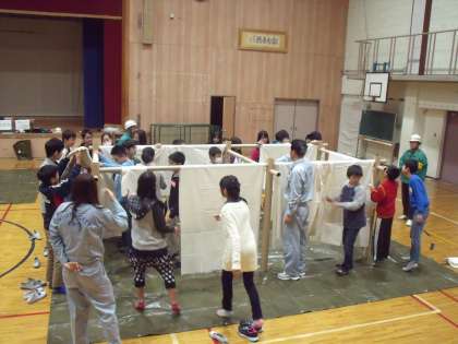 この間仕切りは東日本大震災や熊本地震の時にも役立ったそうです。なんとすぐ近くの京都造形芸術大学が発信しているということに子どもたちは驚いていました。イタリア地震の時にもこの間仕切りが寄付されたそうです。