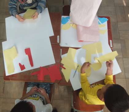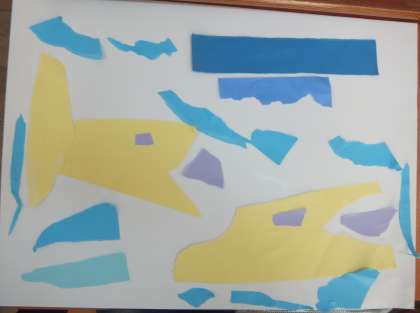 図画工作の時間に,破いた紙の形から思い付いたことを,紙を貼ったりかき加えたりして,絵に表す学習をしています。