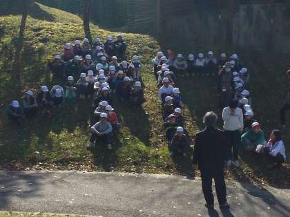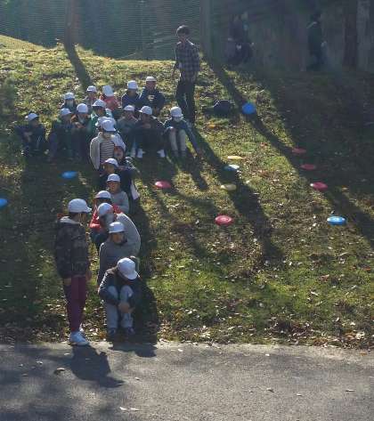 楽しかったフライングディスクゴルフの後は,全員で人文字を作ります!