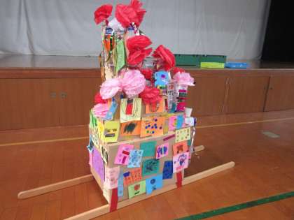 全員のでんでん太鼓を飾ると,大きくて立派なおみこしが完成しました。