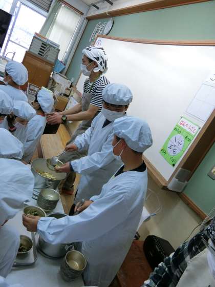 1年生の給食,掃除のお手伝いに行っています。