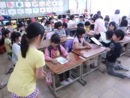昨年育てたあさがおの種を1年生にプレゼントしました。みんなで考えた言葉も元気よく言うことができ,成長したなと感じます。