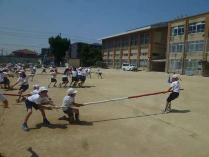 運動会に向けて,棒引きの練習を行っています。3人1組で行うチーム戦と各色の全員で行う団体戦の2種類があります。子ども達は今日の暑さに負けず,一生懸命棒を引っ張っています。どのような試合になるのでしょうか。楽しみです。