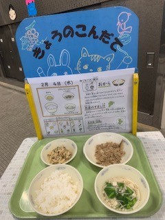 今日の献立は、「ごはん、豚肉とこんにゃくのいため煮、おから、花菜のすまし汁」でした。