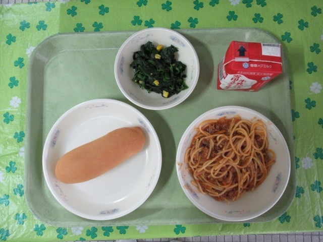 今日の給食は 小型コッペパン 牛乳 スパゲティのミートソース煮 ほうれん草のソテー です。