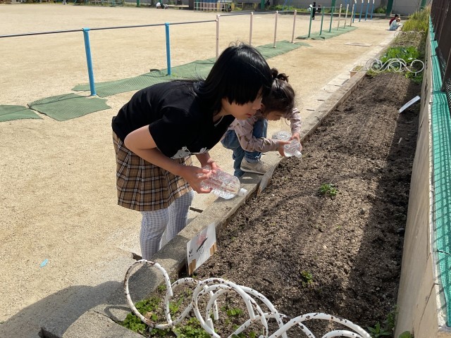 月曜日。手作りのじょうろでやさいに水やりをしました。先週の金曜日には出ていなかったジャガイモの芽やはつかだいこんの芽が出ていました。「(芽が)出ているよ!」「大きくなったよ!」と、喜びの声が聞こえてきました。