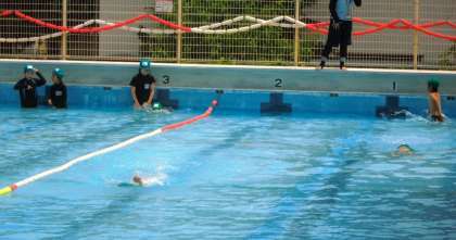 1人が泳いでいる時は,もう1人はプールサイドから励ましたり,タイムを測定したりします。