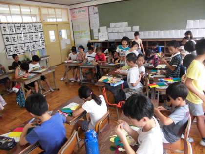 透明のうちわに絵を描いたり,シールつきセロハンを貼ったりしました。