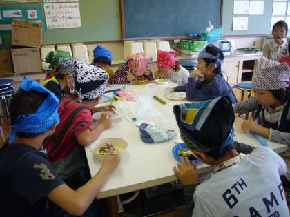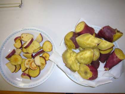 そこで,10月26日(火)に,2年生みんなで「おいもパーティー」をすることにしました。メニューは,おいもを薄く切ってホットプレートでやいたものと,ふかしいもです。薄く切るのは難しかったですが,「包丁を使うときは,ねこの手やで。」と気をつけながら切っていきました。おいもをフライ返しを使ってひっくり返すのも楽しくて,何度もひっくり返して,焼き加減を確かめていました。