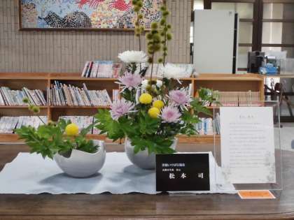 「花育」の取り組みの一環としまして,本館玄関ホールに生け花が展示されています。