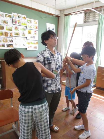 教室の中ではかってみたい長さを,1メートルものさしではかりました。保護者の方も協力してくださいました。