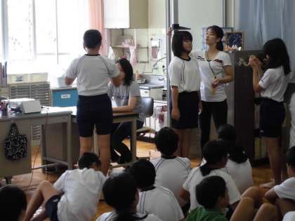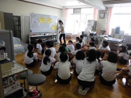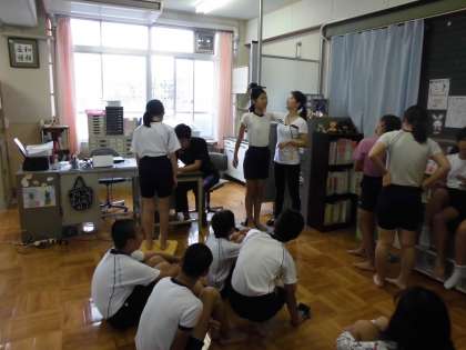 身体計測の前に保健指導をしました。倒れている人を発見した場合,どのような行動をとればいいのかを養護教諭が指導しました。