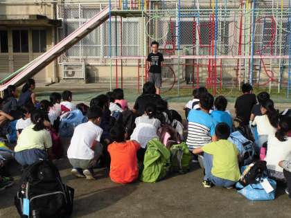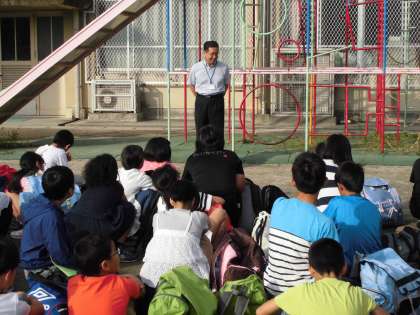 子ども達が運動場に集まり出発式を行いました。司会の子どもの「おはようございます。」の挨拶で出発式が始まりました。