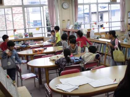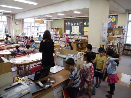 多くの子ども達が図書室で本を借りていました