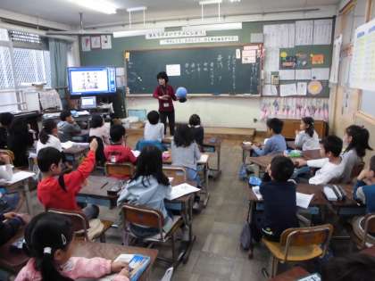 今月の目標の「日本の中の世界をさがそう」の学習をしました。担任の先生が地球儀を使って世界のいろいろな国や地域について子ども達に説明をしました。