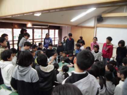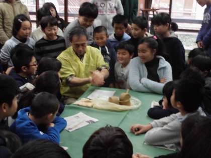 午後から二つ目の活動の花背焼を行いました。はじめに手本を見せてもらい作り方を教えていただきました。教えていただきました方は下鴨小学校の出身で校歌も覚えておられました。