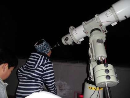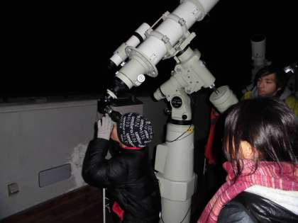 山の家には数台の天体望遠鏡が設置されています。寒空の下きれいな星を観察しました。