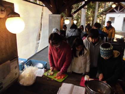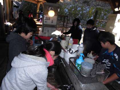 2日目の2つ目の活動は野外炊事です。自分たちで起こした火を使ってごはんと豚汁をつくります。グループで協力して準備を進めました。