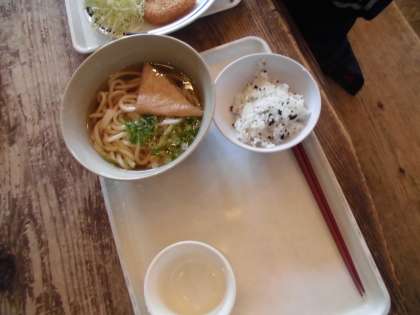 午前中歩き回ったので子どもたちはお腹を空かしていました。昼食は「きつねうどんと梅シソごはん」か「チャーハン」のどちらかを選びました。これら以外にコロッケ,ひじき,千切りダイコンなども選んで食べました。