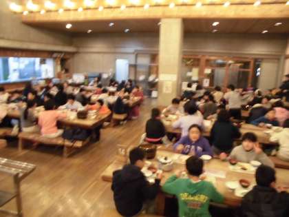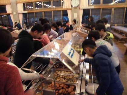 食堂で山の家最後の夕食を食べました。午後のフライングディスクで動き回りお腹が減っていたのでしょうか,しっかり食べていました。
