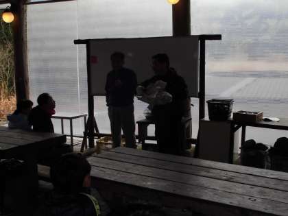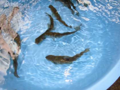 最終日の午前の活動は「魚つかみ・魚さばき」です。山の家の先生から魚のさばき方を教わりました。