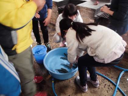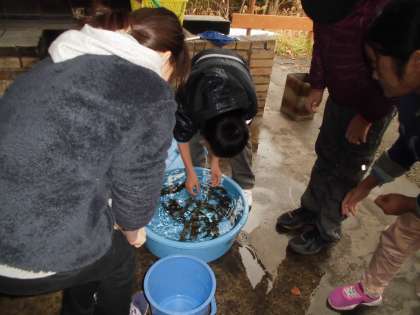 子どもたちは桶に入った魚をつかみました。ぬるっとしていてつかみにくかったようです。