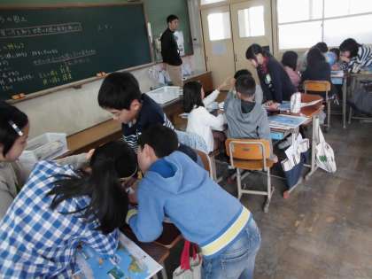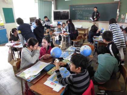 地球儀を使って世界の大陸や海について調べました。地球儀で世界のいろいろな国の場所を調べました。